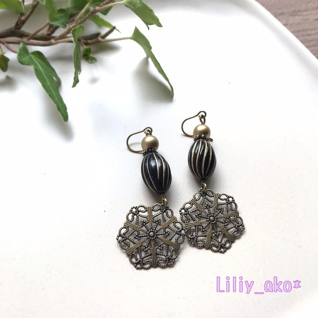 アンティークゴールド×ブラックのピアス