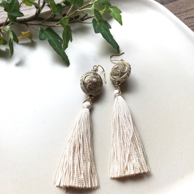 オフホワイトのタッセルピアス