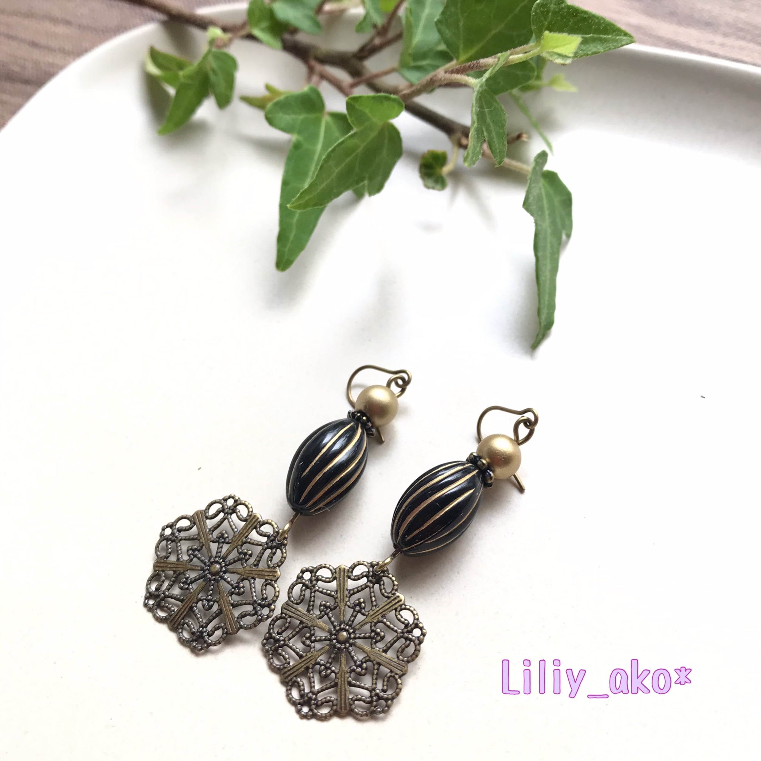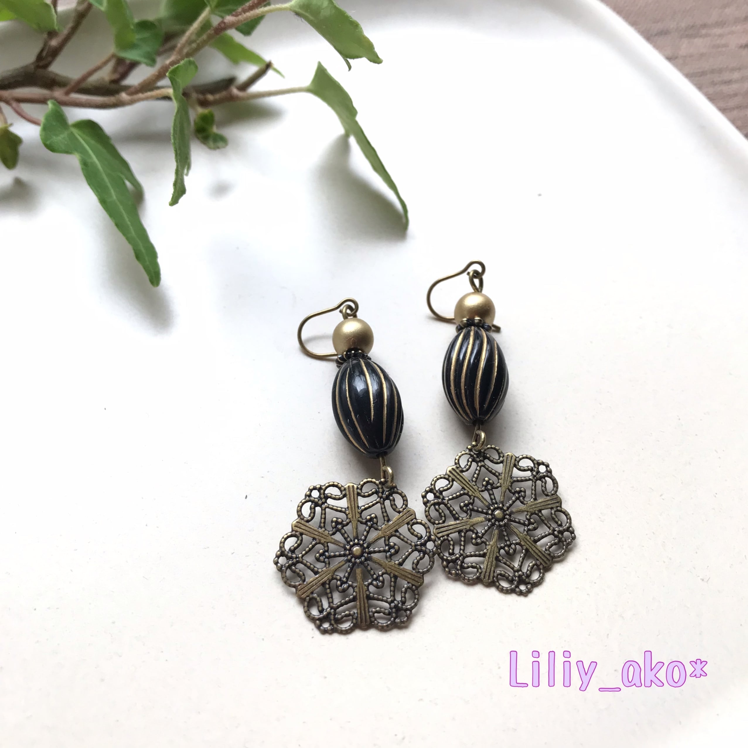 アンティークゴールドの透かしパーツとビーズのエスニックな雰囲気のピアスです♪
